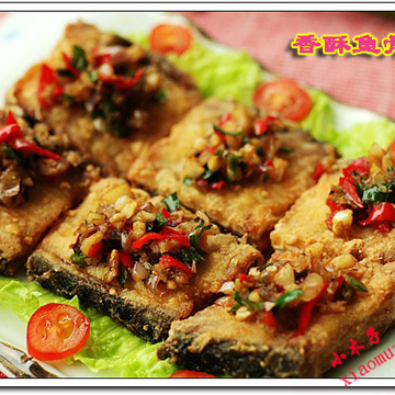 做法:鱼骨两条斩大块,用盐酒腌半个钟,拍上干炸粉用油慢慢煎成两面金黄色,再把葱蒜青红辣椒切碎爆香放在鱼块上即可。